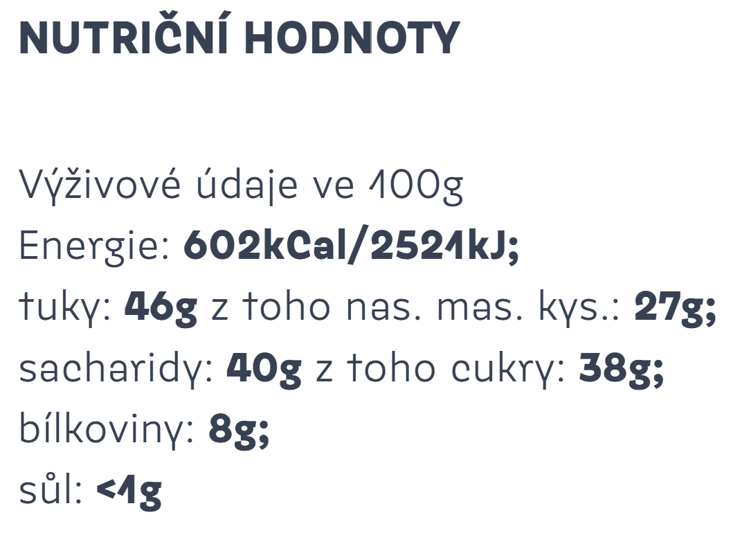 - kakaové máslo, sušené mléko, třtinový cukr, kávová zrna (18 %).