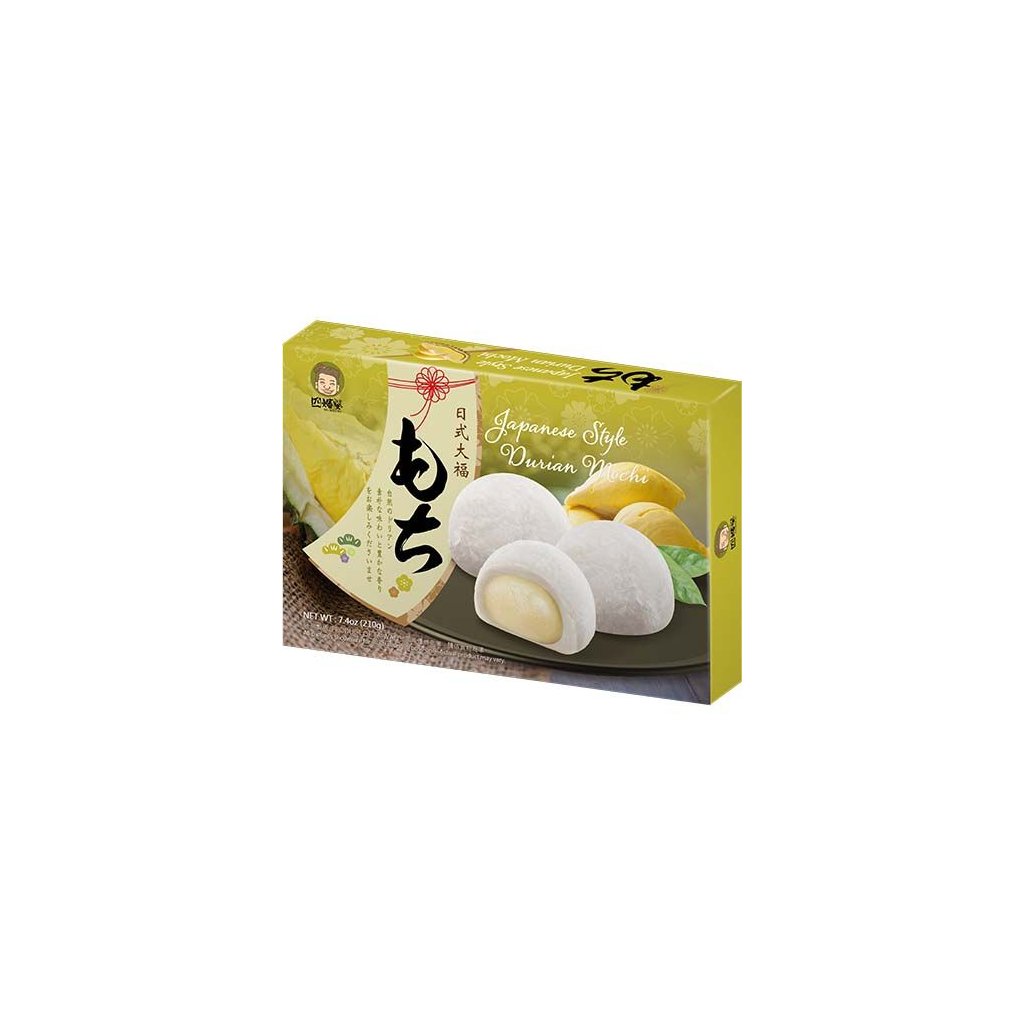 Vynikající sladkost původem z Japonska, vyrobena na Taiwanu. Těstíčko z dlouho stloukané napařené rýže s náplní z fazolek s příchutí durianu. Balení obsahuje 6 krásných mochi knedlíčků.