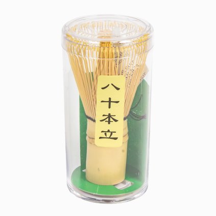Bambusová metlička pro přípravu matcha. „80 štětin“. Označuje chasen s osmdesáti proutky, vyvážený pro běžné použití.