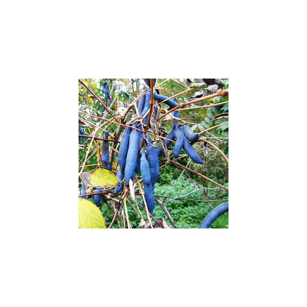 Vzhled: Plody tvoří protáhlé lusky dlouhé 5–10 cm s nápadnou matně modrou až šedomodrou barvou. Právě kvůli tomuto specifickému tvaru a chladnému zbarvení si keř v angličtině vysloužil přezdívku „dead man's fingers“ (prsty mrtvého muže) nebo „blue sausage fruit“ (modré klobásy).