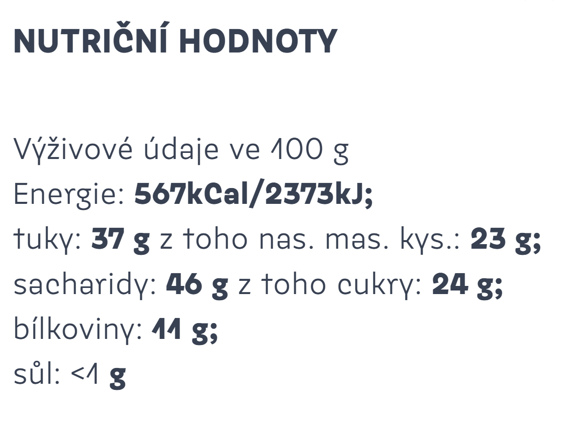 - Čokoláda: kakaové boby, třtinový cukr, kakaové máslo.